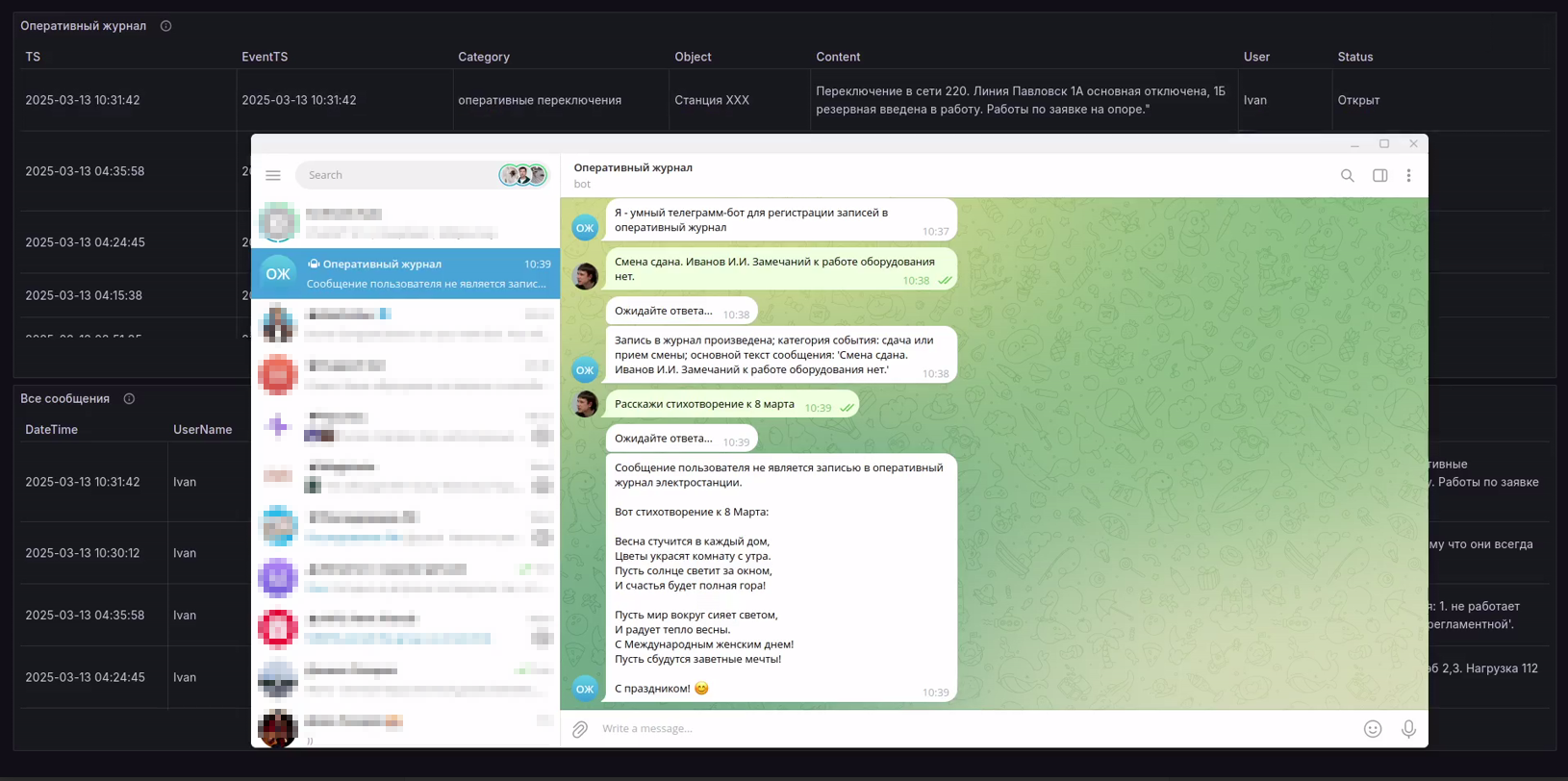 Рисунок 8. Пример заведения сообщений в оперативный журнал через телеграм-бот.