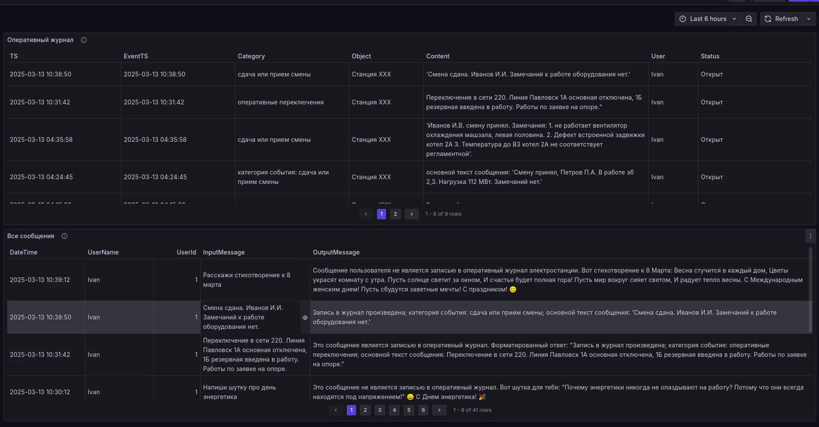 Современные большие языковые модели позволяют сделать следующий шаг во взаимодействии человека с машиной и упростить заведение формализованных записей в строгую форму электронных журналов на естественном языке. Оперативный персонал при этом делает сообщение на естественном языке, указывая основные моменты, которые должны попасть в электронный журнал, но при этом, не соблюдая строго последовательность и формат записи. Большая языковая модель разбирает сообщение оперативного персонала, вычленяет основные моменты в каждой из категорий записи электронного журнала и сохраняет запись в строго формализованном виде.