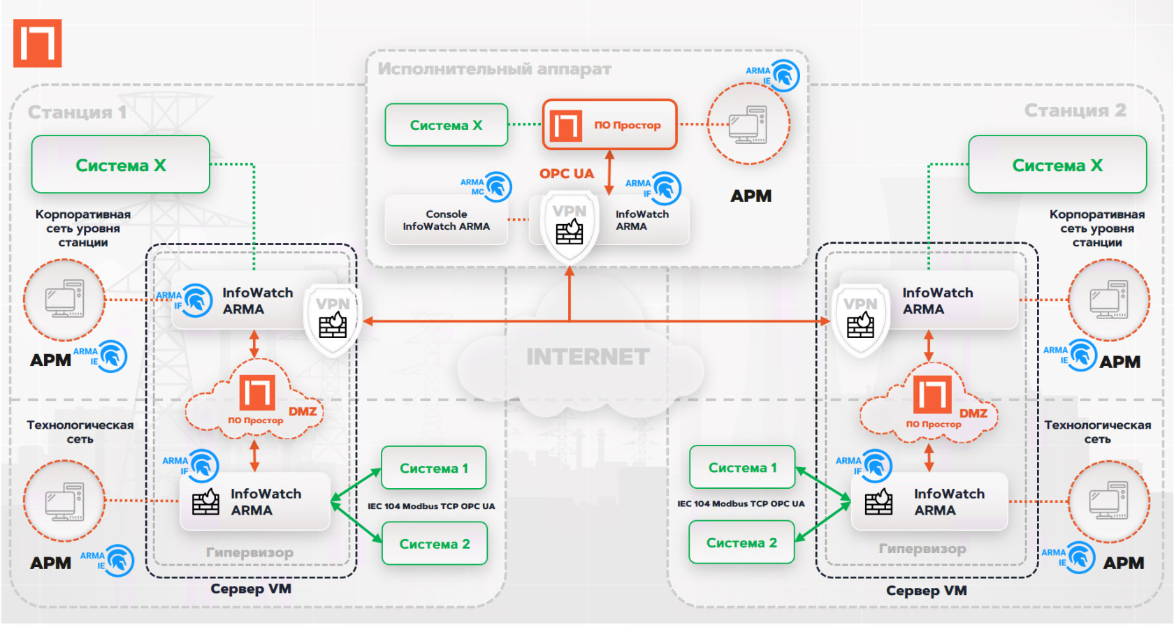 На схеме ниже приведен вариант технического решения ПРОСТОР.ОИК для организации безопасного и функционального, быстродействующего подъема технологических данных с технологического уровня сети до уровня исполнительного аппарата ген.компании, реализации системы мониторинга и аналитика данных на верхнем уровне. Поскольку задачи ОИК могут отличаться в зависимости от конкретного объекта данная схема приведена для примера.