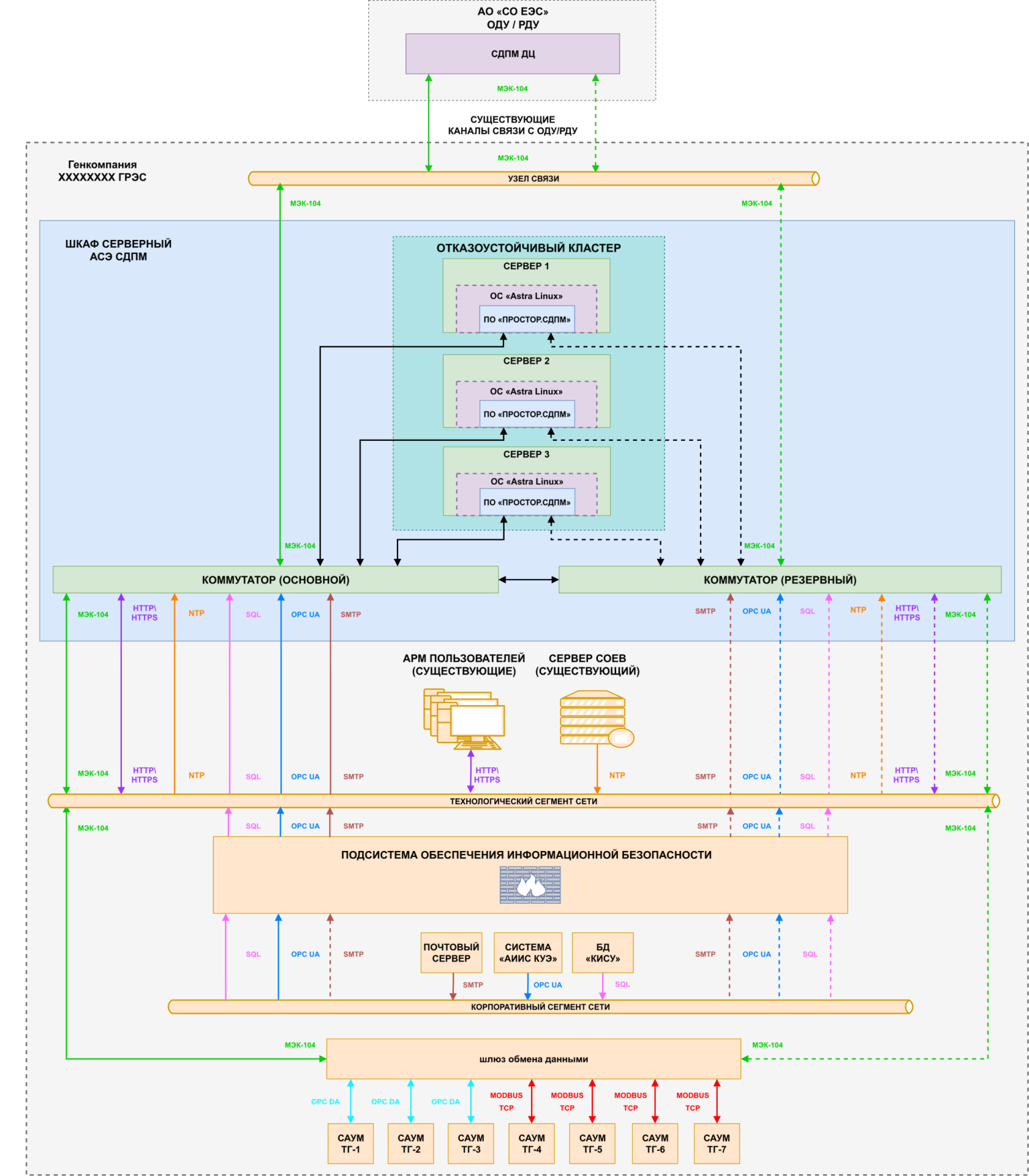 На схеме ниже приведен вариант технического решения ПРОСТОР.СДПМ для организации безопасного и функционального станционного звена системы дистанционного управления плановой мощностью, а также управления диспетчерскими графиками.